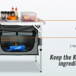 - With adjustable height settings of 21.45″, 24.4″, and 27.56″, this camp kitchen table caters to both adults and children. Its reinforced X-shaped structure ensures superior stability and security during use.