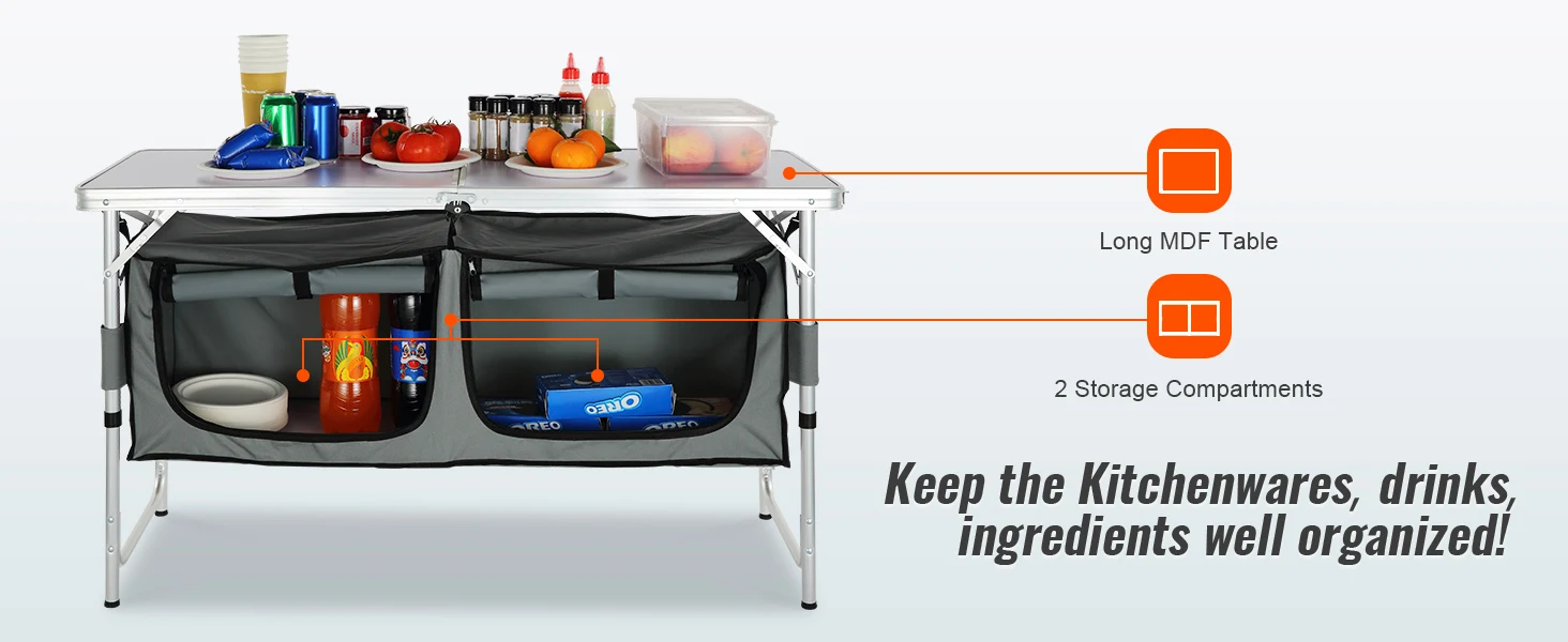 - Designed to optimize your outdoor cooking setup, this camping kitchen table features ample space for organizing food, stoves, grills, and cookware. It includes zippered storage compartments for additional convenience and organization.